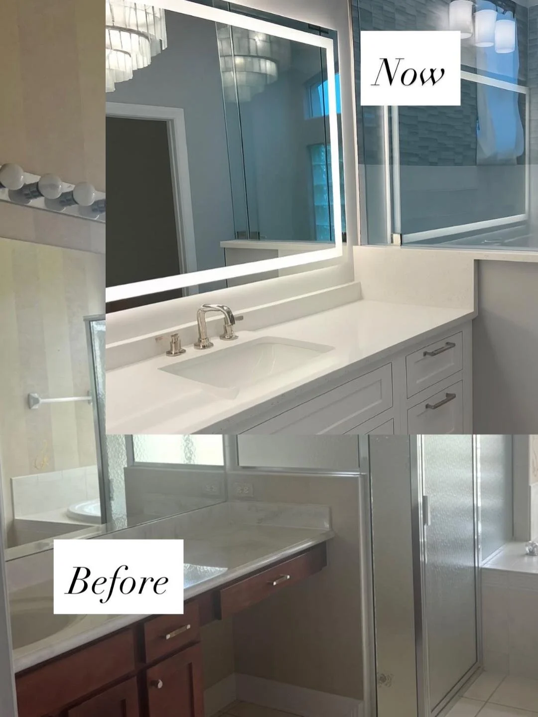 One of the most dramatic improvements in this remodel is the oversized mirror with integrated lighting. The mirror reflects natural light while the LED lighting improves visibility for everyday use.